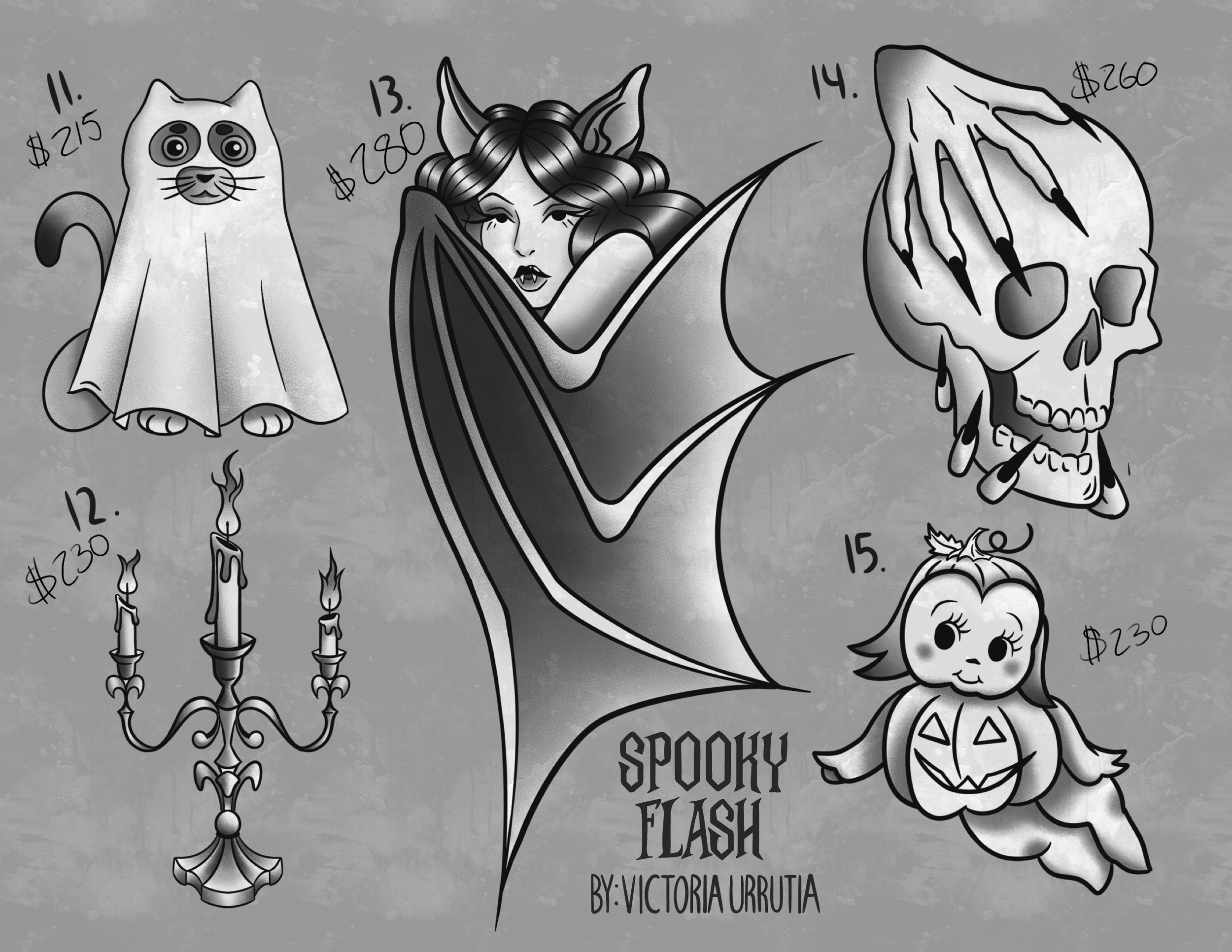Our pre drawn spooky designs were created by our shop artist Austin and our two talented apprentices Victoria and Rosie. Available designs bellow.